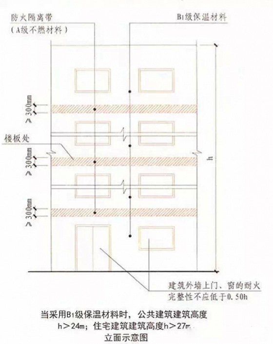 4.當(dāng)建筑的外墻外保溫系統(tǒng)采用燃燒性能為B1、B2級(jí)的保溫材料時(shí),除采用B1級(jí)保溫材料且建筑高度不大于24米的公共建筑或采用B1級(jí)保溫材料且建筑高度不大于27米的住宅建筑外,建筑外墻上門、窗的耐火完整性不應(yīng)低于0.5小時(shí)。