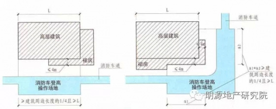1)高層建筑應(yīng)至少沿一個(gè)長(zhǎng)邊或周邊長(zhǎng)度的l/4且不小于一個(gè)長(zhǎng)邊長(zhǎng)度的底邊連續(xù)布置消防車登高操作場(chǎng)地,該范圍內(nèi)的裙房進(jìn)深不應(yīng)大于4米;