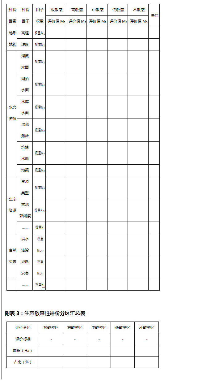 生態(tài)敏感性評(píng)價(jià)應(yīng)首先構(gòu)建評(píng)價(jià)體系并選取生態(tài)敏感性因子,明確評(píng)價(jià)模型及方法,確定評(píng)價(jià)標(biāo)準(zhǔn)并最終明確生態(tài)敏感性的空間分布(詳見附表2)。