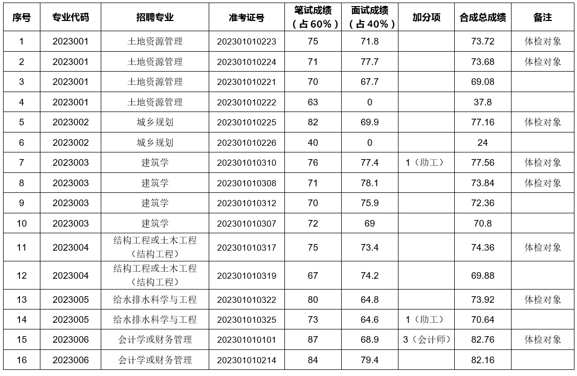 根據(jù)《2023年度滁州市城鄉(xiāng)建設(shè)規(guī)劃設(shè)計(jì)院有限公司公開招聘技術(shù)人員公告》規(guī)定,現(xiàn)將2023年度滁州市城鄉(xiāng)建設(shè)規(guī)劃設(shè)計(jì)院有限公司公開招聘技術(shù)人員筆試、面試、加分合成總成績和體檢對象公布如下: