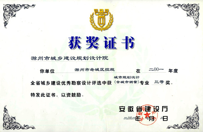滁州市經(jīng)開區(qū)地形圖測(cè)繪規(guī)劃獲獎(jiǎng)證書
